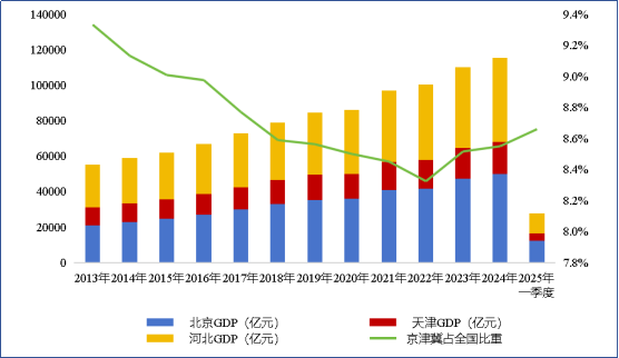 圖1 2013-2025年一季度京津冀三地GDP及全國占比情況