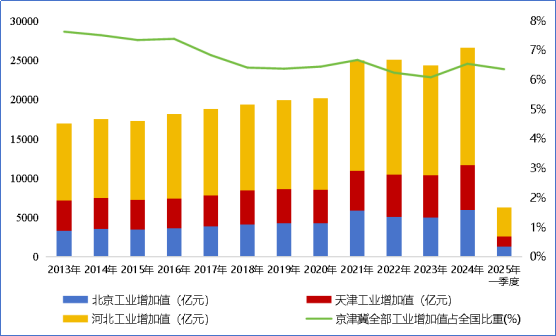 圖2 2013-2025年一季度京津冀地區全部工業增加值變化及全國占比情況