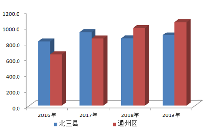 圖1 2016年-2019年北三縣和通州區(qū)地區(qū)生產(chǎn)總值比較(單位:億元)