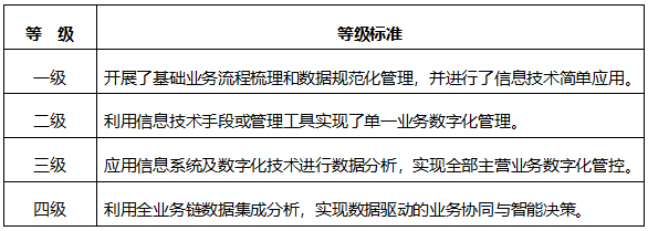 2022年10月,工業(yè)和信息化部發(fā)布了《中小企業(yè)數(shù)字化水平評測指標(biāo)》,從數(shù)字化基礎(chǔ)、經(jīng)營、管理和成效四個(gè)維度評估中小企業(yè)數(shù)字化水平,將數(shù)字化水平劃分為四個(gè)等級(jí)[1](表1)。