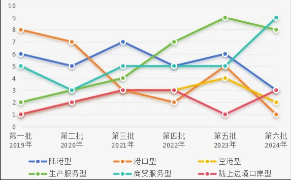 已發布樞紐的類型結構以陸港型、生產服務型和商貿服務型為主,與規劃布局大體一致。近三年樞紐建設類型已逐步向生產服務型和商貿服務型偏移,商貿服務型2024年發布數量取得爆發式增長,但總體占比相較規劃布局仍略有偏差,未來仍屬建設重點。