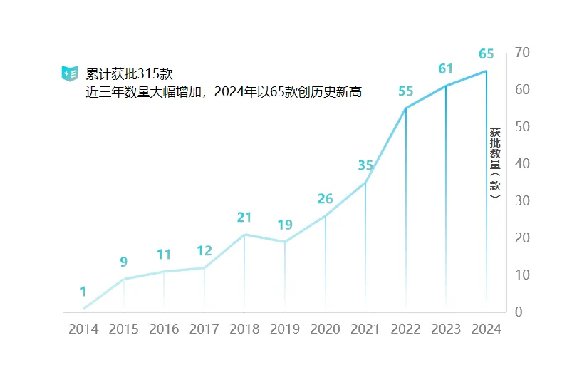 2024年,我國共有65款創新醫療器械獲得國家藥品監督管理局(NMPA)批準上市,獲批數量創歷史新高,總體來看國際化發展態勢不斷增強,區域集聚效能愈發顯著,多款運用國際首創技術的國內首款產品接續發布,展現出強大的創新能力和高質量發展趨勢。獲批產品具體特點如下: