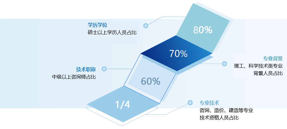 公司為國家高新技術(shù)企業(yè),具有雄厚的咨詢技術(shù)服務(wù)力量,現(xiàn)有員工270余人,其中碩士及以上學(xué)歷占80%以上,理工、科學(xué)技術(shù)類專業(yè)背景人員占比近70%。
